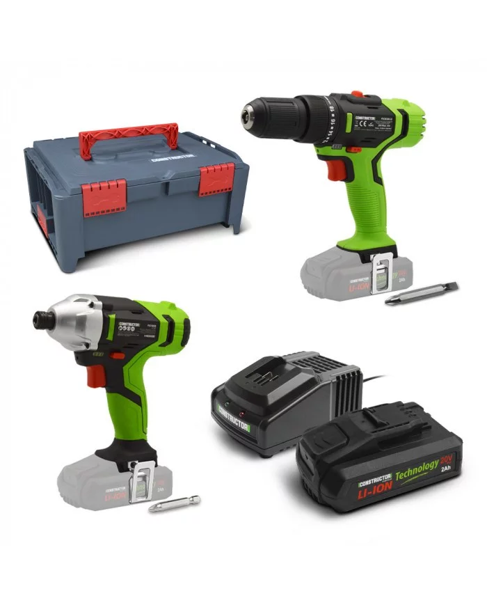 Ce kit d'outils électroportatif sans fil 20V de la marque Constructor est composé d'une perceuse visseuse à percussion (PSCID20B-32), d'une visseuse à chocs (PSCW20B), d'une batterie 2Ah (PSBAT20-2A), d'un chargeur rapide (PSCHBAT20) et d'une boite à outils empilable en plastique (BEPS2).