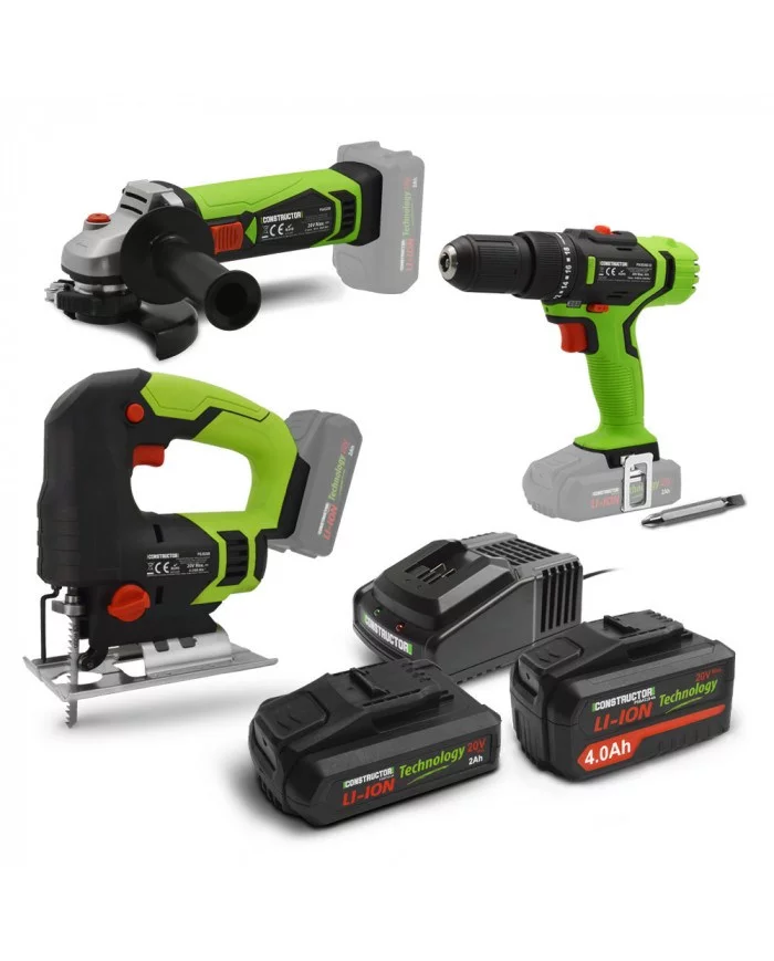 Ce kit d'outils électroportatif sans fil 20V de la marque Constructor est composé d'une perceuse visseuse à percussion (PSCID20B-32), d'une meuleuse d'angle (PSAG20B), d'une scie sauteuse (PSJS20B), d'une batterie 2 Ah (PSBAT20-2A), d'une batterie 4 Ah (PSBAT20-4A) et d'un chargeur rapide (PSCHBAT20).